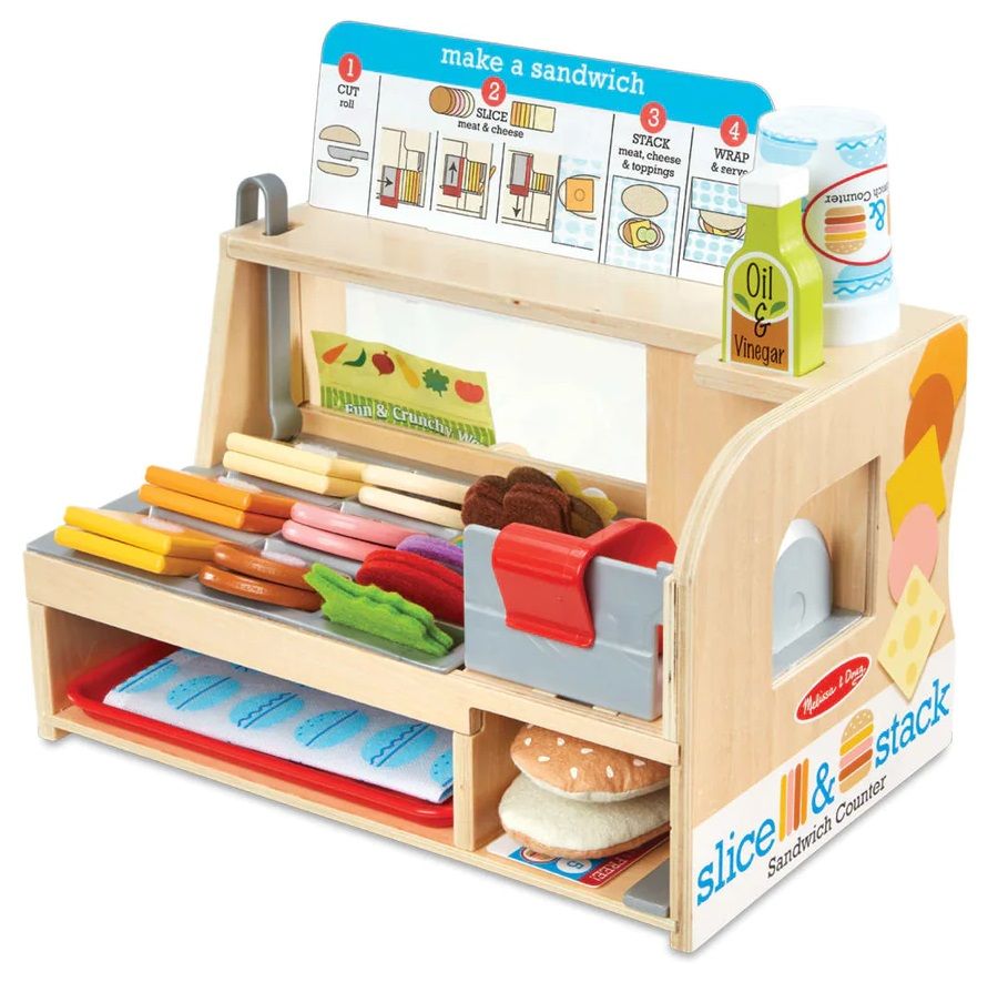 Drewniany bar kanapkowy firmy Melissa & Doug to wyjątkowa zabawka, która pozwala dzieciom na kreatywną zabawę w przygotowywanie pysznych kanapek. Wykonany z wysokiej jakości drewna, bar kanapkowy zawiera różnorodne składniki, takie jak pieczywo, warzywa, mięso i sery, które można dowolnie łączyć, tworząc smakowite kompozycje. Dzięki realistycznym detalom i solidnemu wykonaniu, zabawka nie tylko dostarcza wiele radości, ale również rozwija zdolności manualne i wyobraźnię dziecka. Idealny dla małych kucharzy i fanów zabawy w odgrywanie ról.