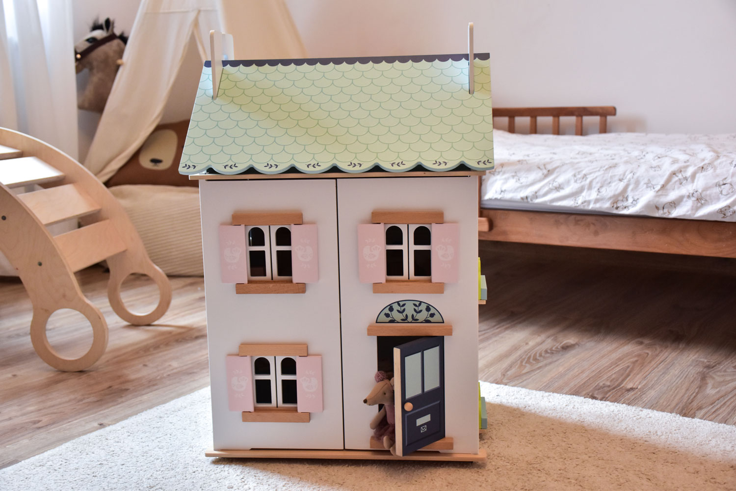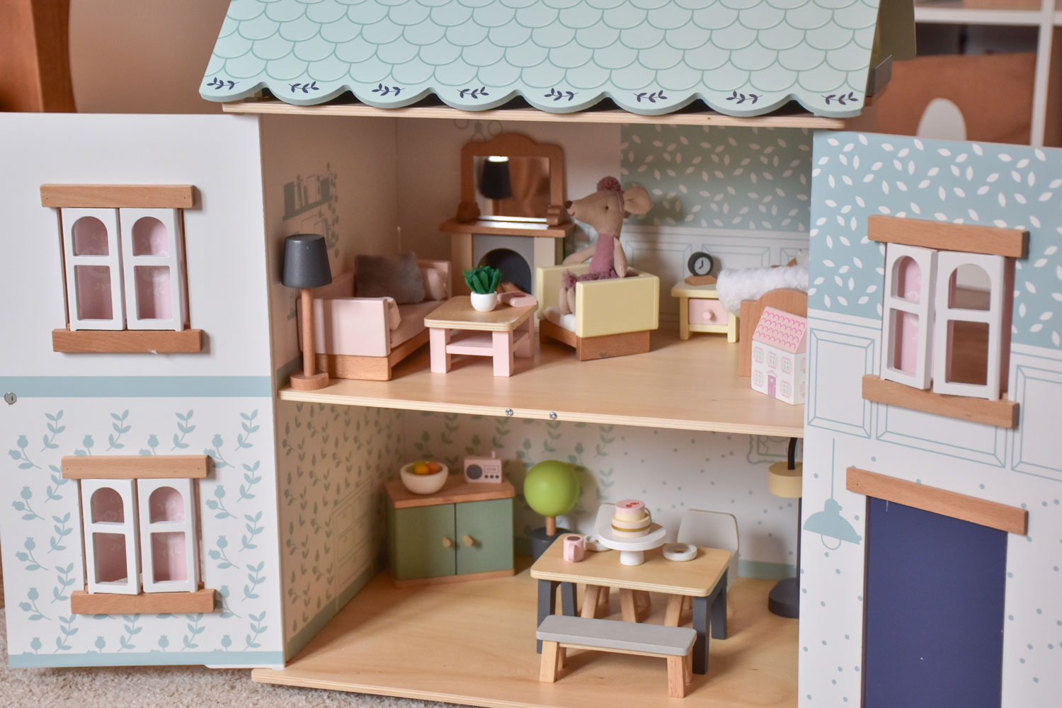 Niesamowity domek dla małych myszek Maileg! Domek dla Lalek Blue Belle od Le Toy Van to nie tylko wyjątkowo piękna zabawka, ale prawdziwy początek niekończących się opowieści, które Twoje dziecko będzie tworzyć z zachwytem. Domek doda uroku każdemu dziecięcemu pokoikowi. Domek został pomalowany nietoksycznymi farbami na bazie wody w pastelowych odcieniach. Domek posiada dwa piętra, otwierane i przepięknie pomalowane okiennice oraz drzwi. Przestrzeń wewnętrzna została ozdobiona tapetami w niebieskich barwach.
