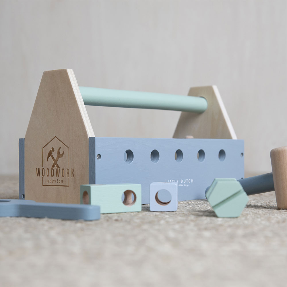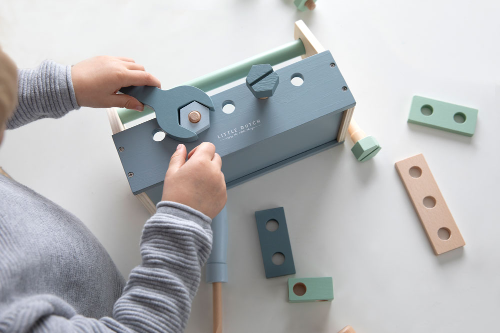 Drewniana skrzynka z narzędziami Little Dutch to fantastyczna zabawka dla dzieci, która rozwija wyobraźnię oraz zdolności manualne. Zestaw zawiera 20 elementów: skrzynkę majsterkowicza, drewniane narzędzia, takie jak młotek, śrubokręt, klucz oraz mnóstwo śrubek i podkładek do tworzenia różnych instalacji. Każdy element jest wykonany z wysokiej jakości drewna, starannie wykończony i pomalowany bezpiecznymi, nietoksycznymi farbami. Dzięki temu dzieci mogą bawić się w małych majsterkowiczów, naprawiać „usterki” w swoim otoczeniu, rozwijając jednocześnie koordynację ręka-oko oraz umiejętności logicznego myślenia. Zabawka zachęca do samodzielnego działania, wspomaga kreatywność oraz uczy koncentracji. Skrzynka jest lekka i poręczna, co pozwala łatwo przenosić ją z miejsca na miejsce, a wszystkie narzędzia można wygodnie przechowywać w jej wnętrzu, ucząc dziecko dbałości o porządek.