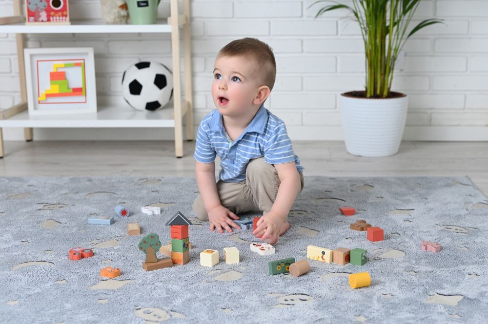 - klocki o różnych kształtach z nadrukiem drzew, zwierząt, owoców, płotków
