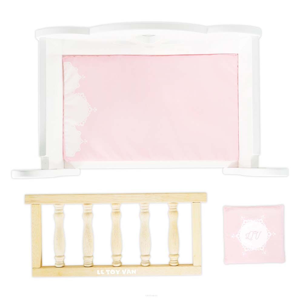 Drewniane łóżeczko dla lalek od Le Toy Van to połączenie klasycznego stylu vintage i najwyższej jakości wykonania, które zachwyci zarówno dzieci, jak i dorosłych. Łóżeczko ma funkcję zdejmowanej bocznej ścianki. Idealny rozmiar dla lalek i pluszaków o wielkości do około 30 cm. W zestawie komplet pościeli: poduszka, koc i materac w odcieniu różu.