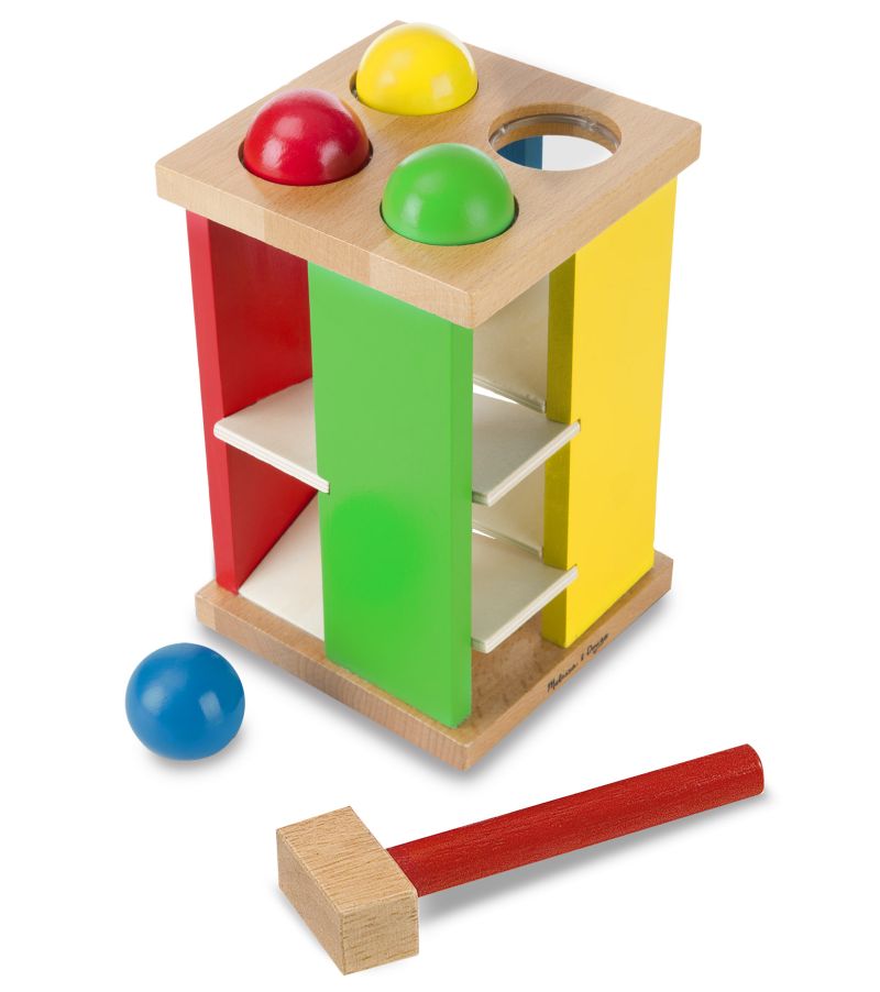 Drewniana wieża przebijanka z kolorowymi kulkami i młotkiem od marki Melissa & Doug to klasyczna zabawka edukacyjna, która rozwija zdolności manualne i koordynację ruchową u dzieci. Zabawka składa się z drewnianej wieży, w której znajdują się otwory na kolorowe kulki. Dziecko za pomocą młotka uderza w kulki, wbijając je do środka wieży, po czym spadają one na dół. Zabawka zawiera cztery kulki w różnych kolorach oraz młotek dostosowany do małych rączek dziecka.