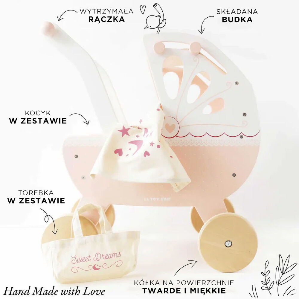 Zabierz lalki na magiczny spacer dzięki eleganckiemu, drewnianemu wózkowi Sweetdreams od Le Toy Van! To pięknie zaprojektowana zabawka, która zachwyci każde dziecko i stanie się idealnym towarzyszem kreatywnych zabaw.