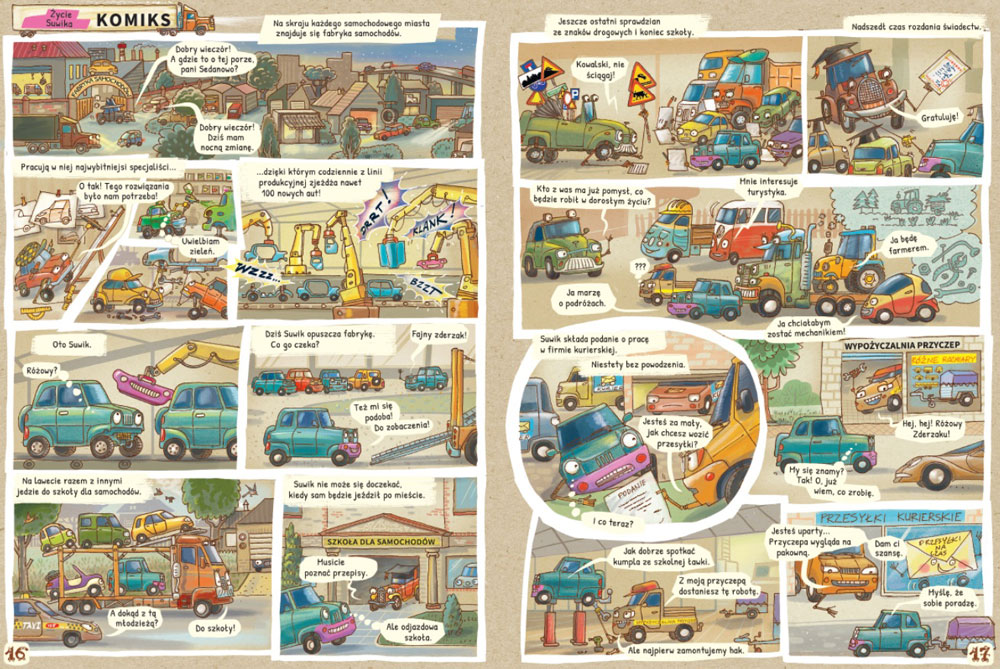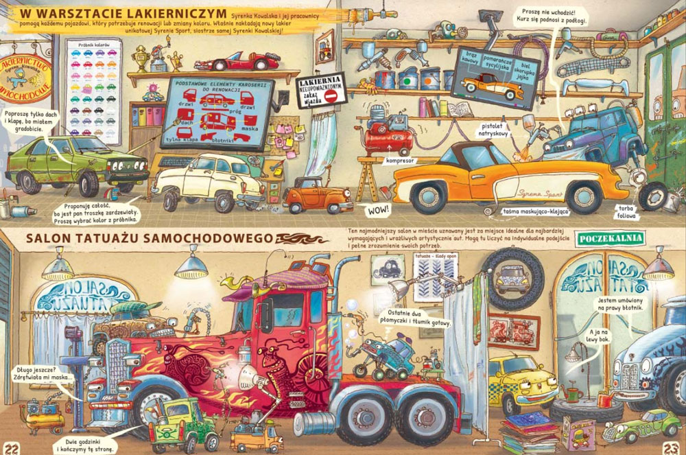 Takiej książki jeszcze nie było! Dowiesz się z niej, co samochody lubią, a za czym nie przepadają, jak są zbudowane czy co robią przez całe życie. Wehikuł czasu zabierze cię w podróż w przeszłość, aż do epoki dinoaut, oraz w przyszłość… Przyjrzysz się pracy projektantów, poznasz niezwykłe wyścigówki, odwiedzisz wielkie samochodowe miasto, zajrzysz do szkoły dla aut, parku samochodowego i na targi. Ale uwaga! Między faktami mogło się zaplątać trochę plotek… choć przecież w każdej plotce jest ziarenko prawdy.