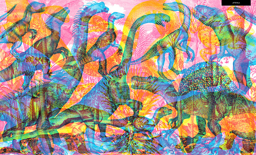 Każda z kolorowych ilustracji skrywa w sobie trzy „warstwy”. Obejrzysz je przez kolorowe filtry dołączone do książki. Przez czerwony zobaczysz dinozaury, przez zielony – ich środowisko życia, a przez niebieski – prehistoryczne rośliny i zwierzęta.