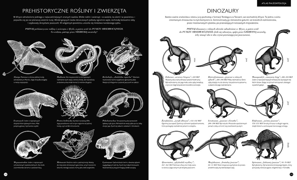 Książka składa się z 10 rozdziałów prezentujących poszczególne części świata w erze mezozoicznej. W każdym znajduje się opis prehistorii danego regionu, czarno-biały przewodnik po tamtejszych gatunkach dinozaurów, prehistorycznych zwierząt i roślin oraz duże barwne ilustracje do oglądania przez kolorowe filtry (lub przez telefon komórkowy – za pomocą strony autora)