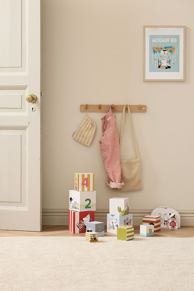 Każda kostka ozdobiona jest inną ilustracją ze świata Muminków: Tatuś Muminka odpoczywający w słońcu, Mamusia Muminka w bujanym fotelu, Muminek budujący coś z piasku czy Panna Migotka w letnim stroju. Sceny te zachęcają do opowiadania historii i rozmów z maluchem.