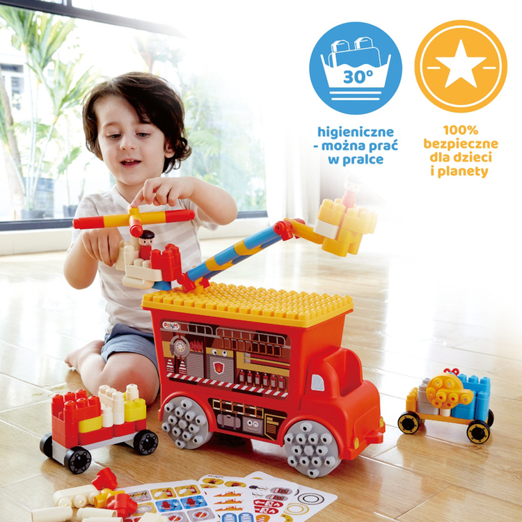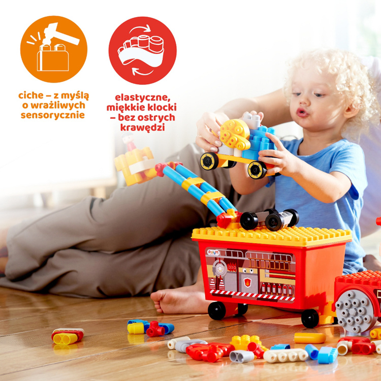 Zestaw klocków konstrukcyjnych PolyM „Straż Pożarna” to idealna zabawka dla małych budowniczych i przyszłych bohaterów akcji ratunkowych! Ten zestaw edukacyjny, przeznaczony dla dzieci od 18. miesiąca życia, zawiera aż 106 elementów, dzięki którym maluchy mogą budować pojazdy strażackie, budynki oraz inne konstrukcje tematyczne.