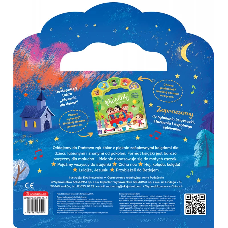 Oddajemy do Państwa rąk zbiór z pięknie zaśpiewnymi kolędami dla dzieci, lubianymi i znanymi od pokoleń. Format książki jest bardzo poręczny dla malucha idealnie dopasowuje się do małych rączek. Kolorowe ilustracje oraz teksty każdej z kolęd zachęcą dziecko do wspólnego śpiewania. Teksty otoczone są kolorowymi ilustracjami, nawiązującymi do treści piosenek, często je uzupełniają, a co najważniejsze zachęcają do wspólnego kolędowania. Nagranie można włączyć, naciskając obrazek na rączce jeden obrazek odpowiada jednej kolędzie. W każdej chwili można wyłączyć grającą melodię, ponownie naciskając obrazek. Książka działa na baterie, które można wyjąć i wymienić. Istnieje również możliwość wyłączenia grających piosenek, przesuwając guzik przy baterii. Książka sprawdzi się dla dzieci w każdym wieku. Młodsze mogą tylko słuchać piosenek, starsze dzieci mogą przeczytać tekst i śpiewać równocześnie z nagraniem. W zbiorze znajduje się pięć popularnych kolęd wraz z nagraniami: Pójdźmy wszyscy do stajenki, Cicha noc, Hej, kolęda, kolęda!, Lulajże, Jezuniu, Przybieżeli do Betlejem.