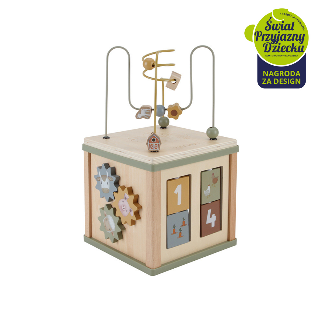 Kostka aktywizująca od Little Dutch to interaktywna zabawka, która stymuluje rozwój zmysłów i zdolności manualnych u najmłodszych. Każda strona kostki oferuje inną, angażującą atrakcję sorter ze zwierzątkami, obracające się koła zębate, ruchome elementy i spirale z koralikami. Motywy nawiązujące do farmy z kolekcji Little Farm, nie tylko wprowadzają dziecko w świat przyrody, ale także pomagają rozwijać wyobraźnię. Kostka wykonana jest z bezpiecznych materiałów i posiada solidną konstrukcję, dzięki czemu doskonale sprawdza się jako zabawka wspierająca rozwój koordynacji ruchowej i koncentracji. Zabawka wykonana jest z drewna z certyfikatem FSC i pokryta farbami na bazie wody. Idealna dla dzieci już od pierwszych miesięcy życia.