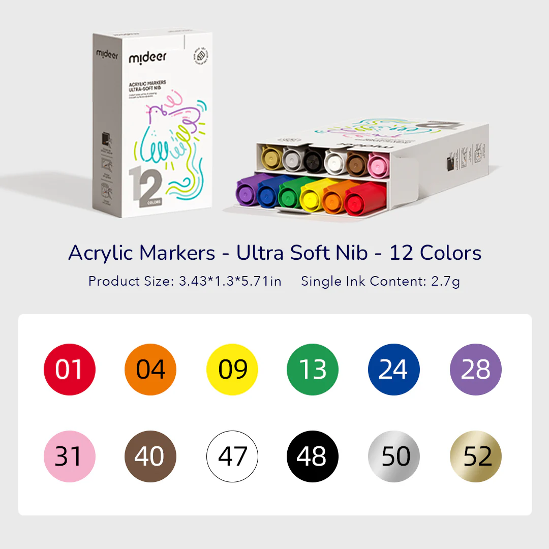 Markery akrylowe – Bardzo miękka stalówka (12 kolorów) Mideer