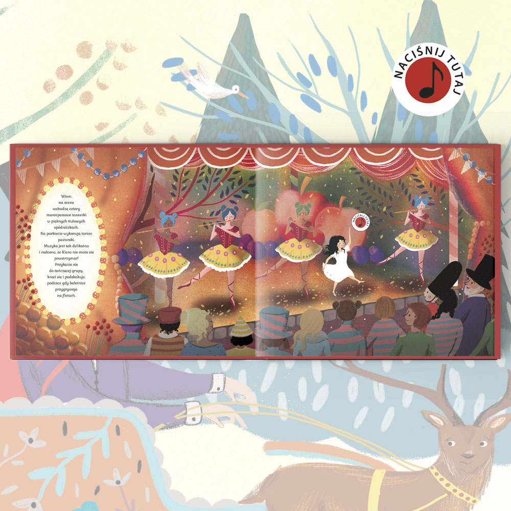 Na każdej stronie czeka niespodzianka: specjalny przycisk w kształcie nutki, który odtwarza fragmenty pięknej muzyki Piotra Czajkowskiego. Dzięki temu mali czytelnicy nie tylko poznają historię, ale także poczują jej wyjątkowy klimat.
