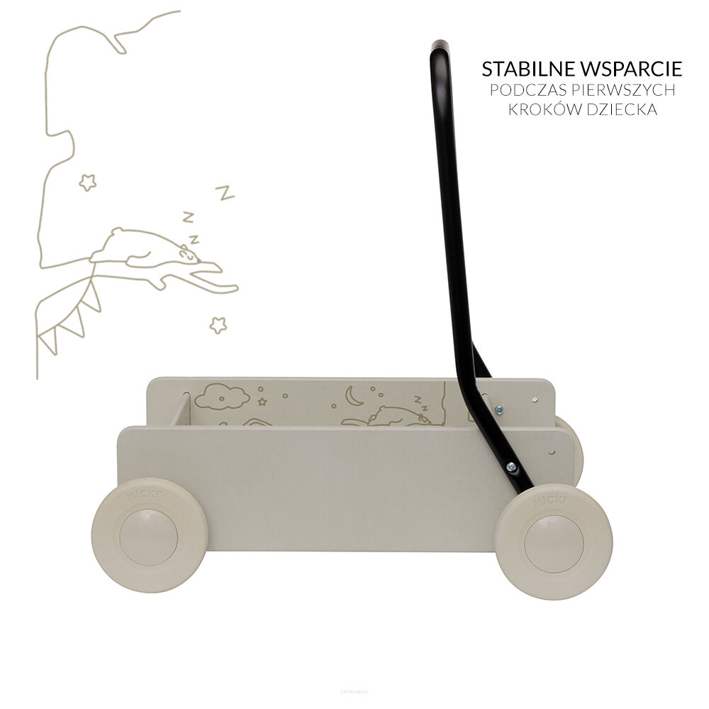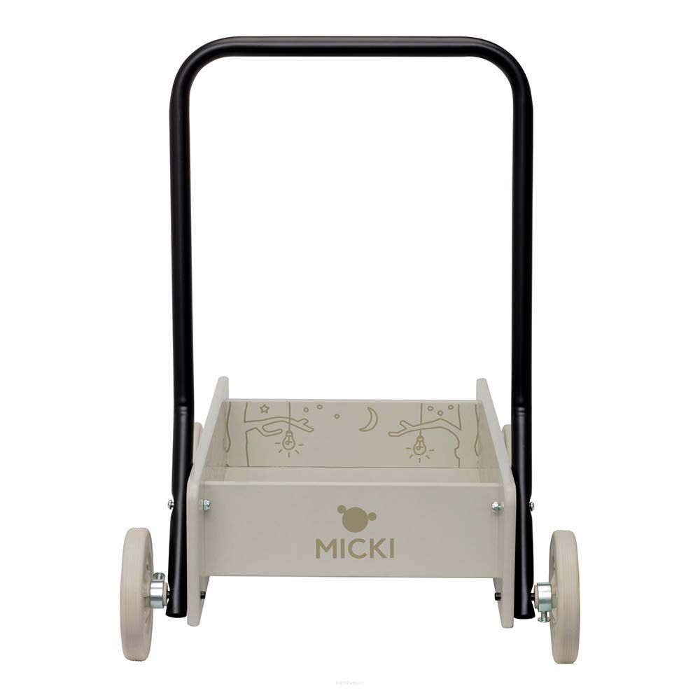 Pchacz dla dzieci szwedzkiej firmy Micki wykonany z drewna, posiada wygrawerowane detale. Pchacz zapewnia stabilne i pewne wsparcie dla pierwszych kroków dziecka, ma koła z hamulcami oraz regulowaną rączkę. Gdy dziecko nauczy się chodzić, rączkę można dostosować, aby zrobić z pchacza wózek dla lalek, który można używać przez wiele lat. Wewnątrz pchacza można przechowywać klocki lub zabawki