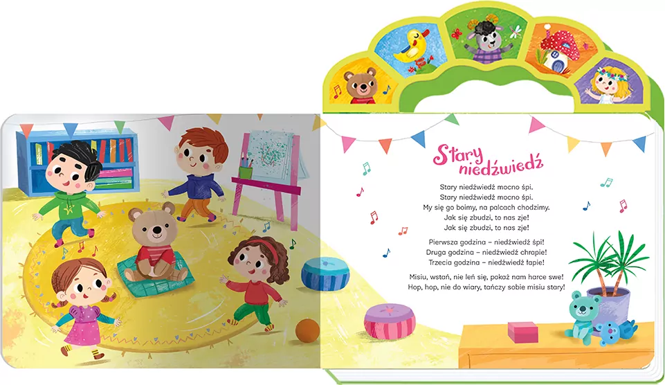 Oddajemy do Państwa rąk zbiór z pięknie zaśpiewnymi piosenkami dla dzieci, lubianymi i znanymi od pokoleń. Format książki jest bardzo poręczny dla malucha – idealnie dopasowuje się do małych rączek. Kolorowe ilustracje oraz teksty każdej z piosenek zachęcą dziecko do wspólnego śpiewania. Teksty otoczone są kolorowymi ilustracjami, nawiązującymi do treści piosenek, często je uzupełniają, a co najważniejsze – zachęcają do wspólnej zabawy. Piosenkę można włączyć, naciskając obrazek na rączce – jeden obrazek odpowiada jednej piosence. W każdej chwili można wyłączyć grającą melodię, ponownie naciskając obrazek. Książka działa na baterie, które można wyjąć i wymienić. Istnieje również możliwość wyłączenia grających piosenek, przesuwając guzik przy baterii. Książka sprawdzi się dla dzieci w każdym wieku. Młodsze mogą tylko słuchać piosenek, starsze dzieci mogą przeczytać tekst i śpiewać równocześnie z nagraniem. W zbiorze znajduje się pięć popularnych piosenek wraz z nagraniami: Stary niedźwiedź, Koła autobusu, O czarnym baranie, My jesteśmy krasnoludki, Dorotka.