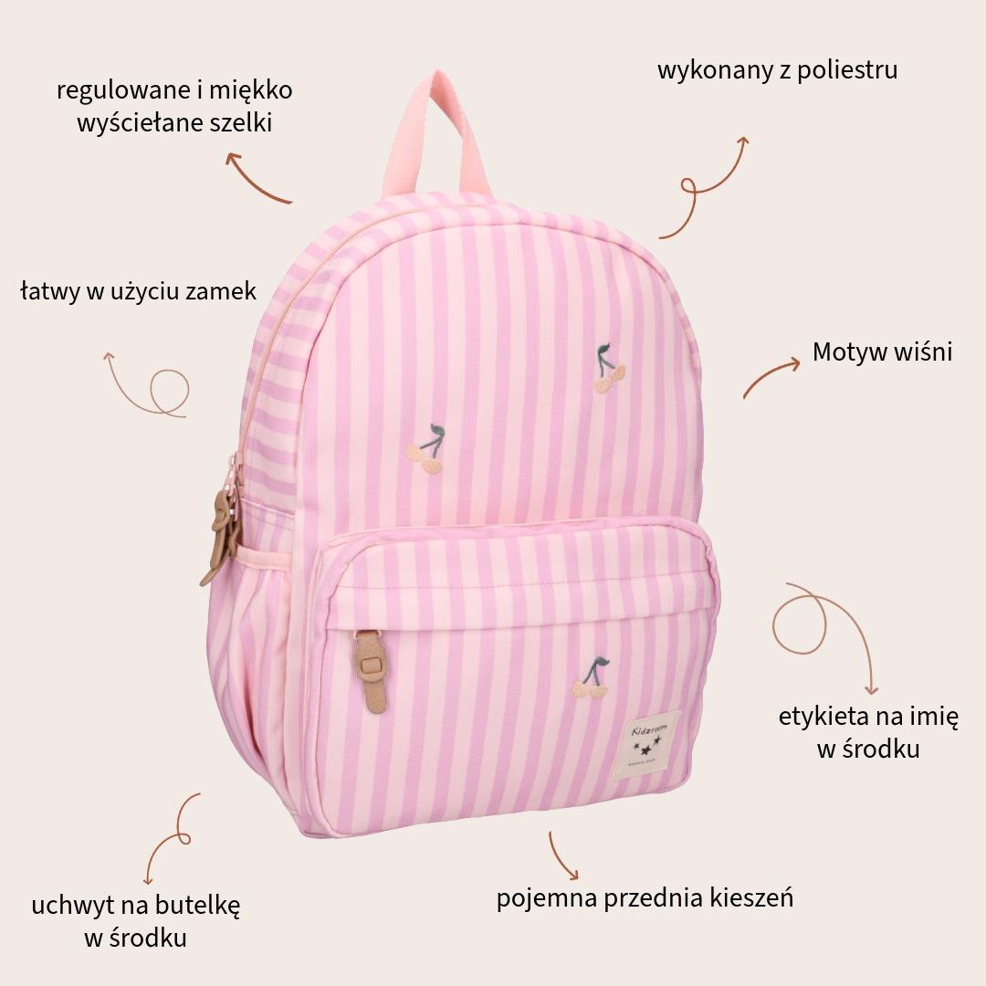 Plecak z kolekcji Kidzroom Nostalgia to doskonały wybór dla starszaków. Pastelowy róż w delikatne paseczki, ozdobiony haftem uroczych cytryn. Większy rozmiar z łatwością mieści format A4, dzięki czemu świetnie sprawdzi się także dla nieco starszych dzieci.