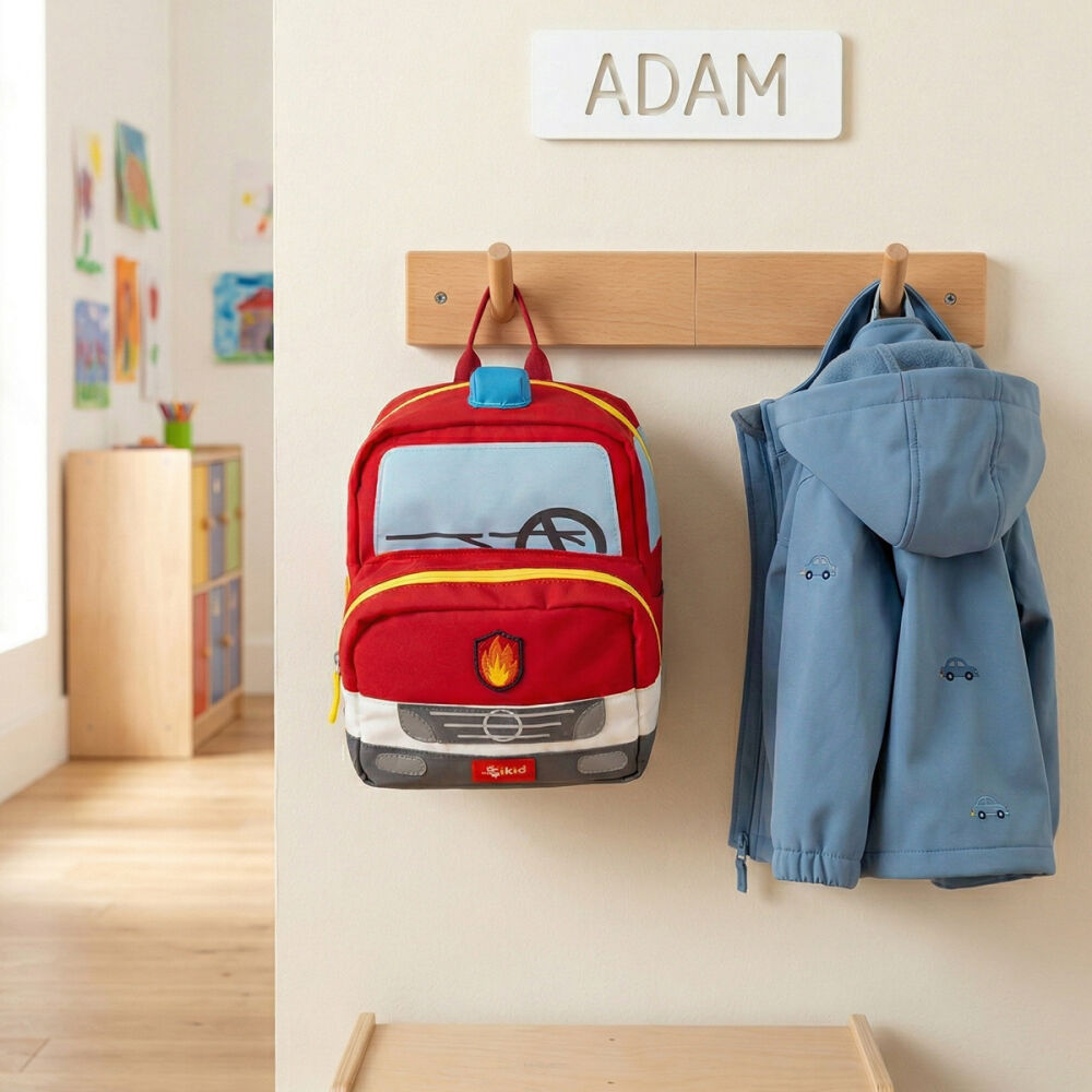 Plecak oferuje przemyślaną organizację przestrzeni – główna komora pełni rolę kabiny kierowcy, przednia kieszeń to „silnik”, a boczne elementy imitujące koła również służą jako praktyczne schowki. Dzięki temu dziecko z łatwością zmieści lunchbox, bidon, przytulankę oraz inne niezbędne drobiazgi.