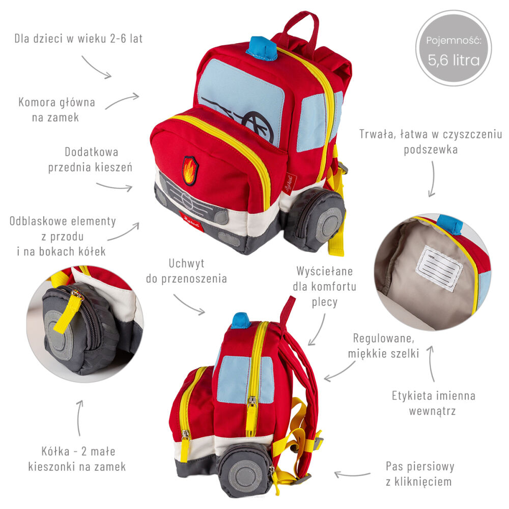 Plecak dziecięcy Straż Pożarna od sigikid to wyjątkowy model, który zachwyca swoim wyglądem – został zaprojektowany na kształt wozu strażackiego. To idealny wybór dla małych fanów straży pożarnej, którzy chcą mieć swój ulubiony motyw zawsze przy sobie.
