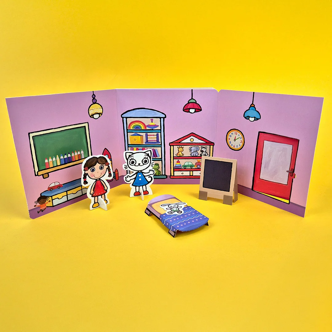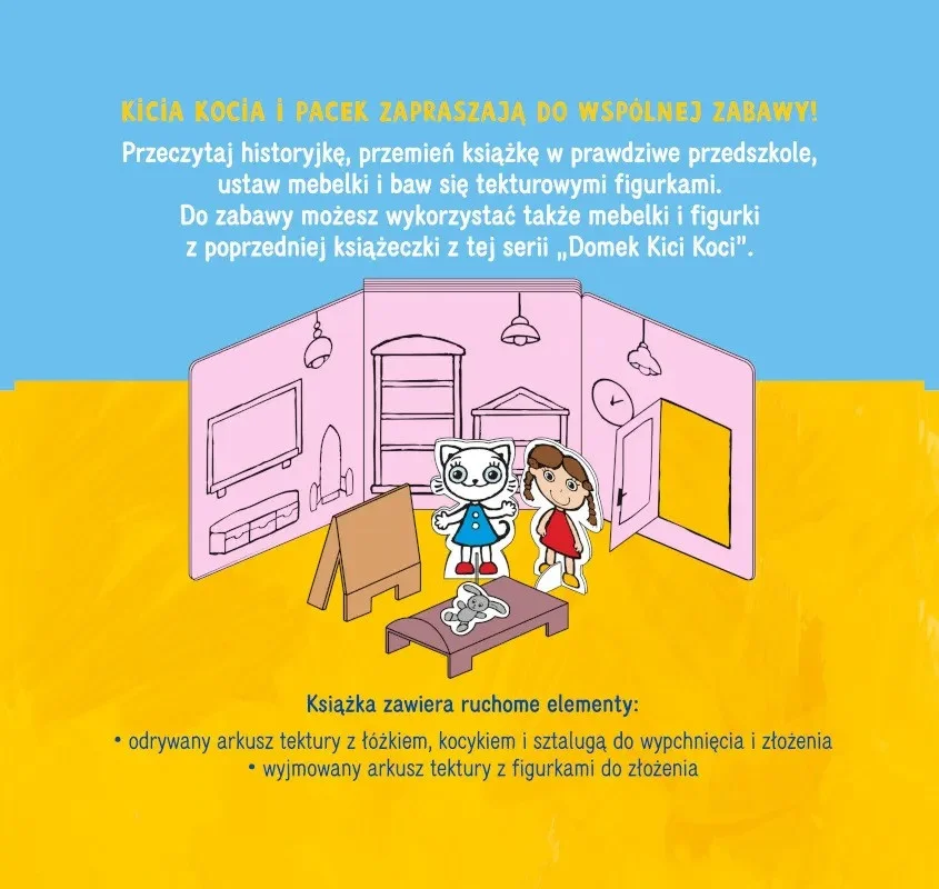 Przeczytaj historyjkę, przemień książkę w prawdziwe przedszkole, ustaw mebelki i baw się tekturowymi figurkami. Do zabawy możesz wykorzystać także mebelki i figurki z poprzedniej książeczki z tej serii „Domek Kici Koci”.