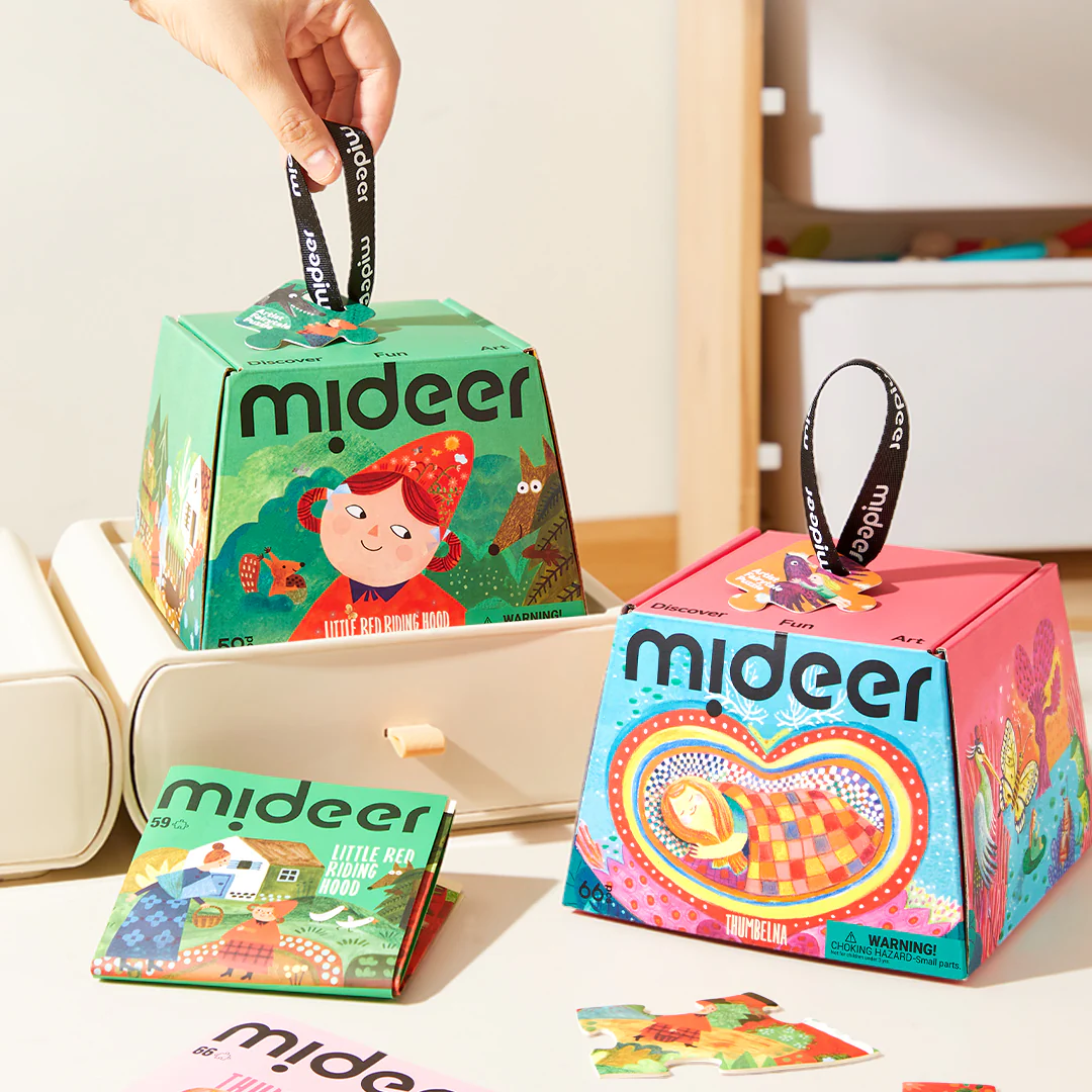 Wejdź do zaczarowanego lasu, gdzie miękki mech szeleści pod stopami, a cień wilka czai się między drzewami… Puzzle Czerwony Kapturek marki Mideer to niezwykła układanka, która przenosi dzieci w sam środek ulubionej bajki – kawałek po kawałku.