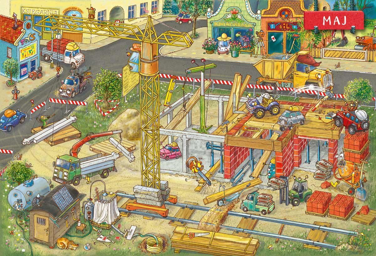 Książka jest podzielona na dwanaście rozkładówek, przedstawiających zmieniający się plac budowy w kolejnych miesiącach roku. Na początku dzieci znajdą także strony z prezentacją maszyn oraz interaktywną zabawą. Ilustracje są pełne szczegółów i zapraszają do długiej obserwacji, rozwijając spostrzegawczość i zdolność opowiadania.