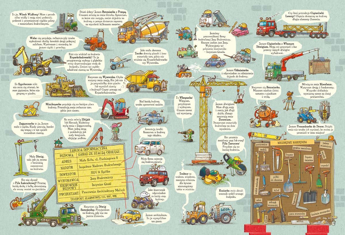 „Rok na placu budowy” to fascynująca książka dla małych miłośników motoryzacji i budownictwa, która pozwala śledzić krok po kroku powstawanie parkingu ze stacją obsługi pojazdów i myjnią. Przez cały rok na placu budowy wiele się dzieje, a za wszystko odpowiada ekipa maszyn budowlanych, prowadzona przez Jeepa Budowniczego. Towarzyszą mu między innymi Koparka, Walec, Spychacz, Żuraw i Betoniarka – każdy z bohaterów ma swoją specjalną rolę i wkład w realizację projektu.