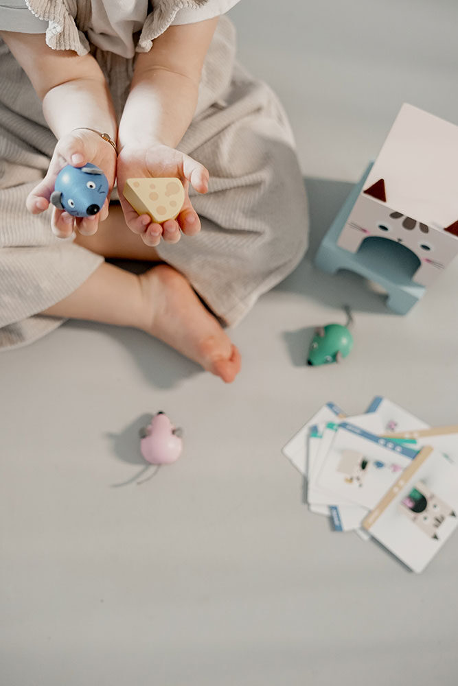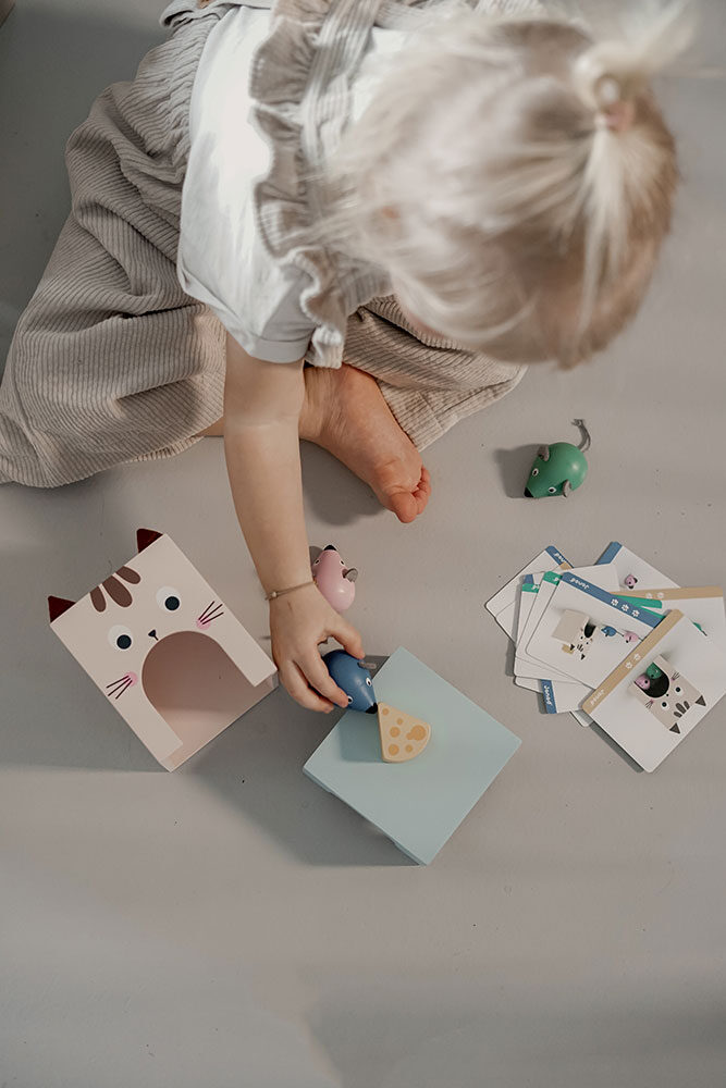 - 6 drewnianych figur: kot, stolik, 3 myszki i żółty ser