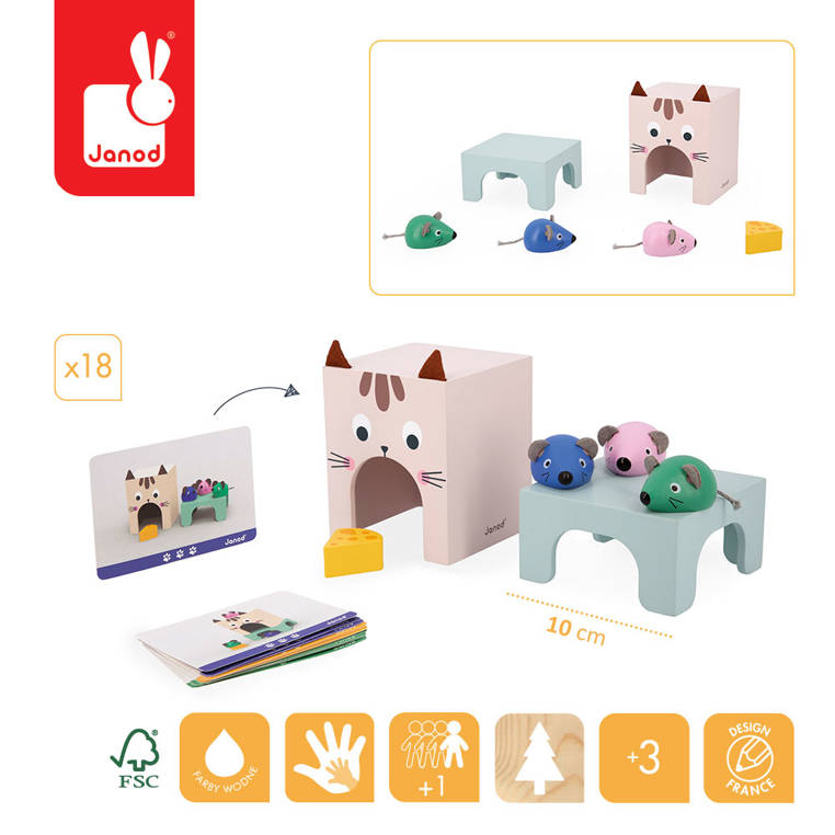 Układanka drewniana „Orientacja w Przestrzeni: Kot i Mysz” francuskiej firmy Janod to kreatywna, edukacyjna zabawka przeznaczona dla dzieci od 3. roku życia. Jej głównym celem jest nauka orientacji przestrzennej, rozwijanie zdolności logicznego myślenia i koordynacji wzrokowo-ruchowej. Układanka wykonana jest z drewna, co zapewnia jej trwałość i bezpieczne użytkowanie.
