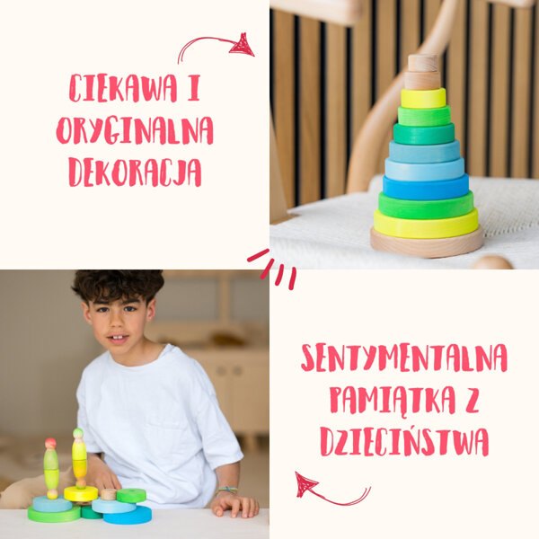 - Skład zestawu: 10 drewnianych krążków nakładanych na drewnianą podstawkę z drążkiem