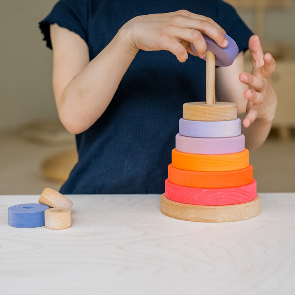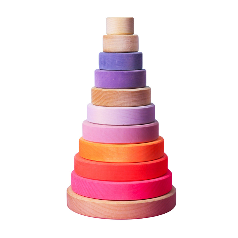 Stożkowa wieża to klasyka wśród zabawek dla najmłodszych. Jej unikalność tkwi w prostocie i doskonałym wykonaniu. Drewniane krążki zostały tak wyszlifowane i wykończone, by ich dotykanie było prawdziwą przyjemnością. Są aksamitnie gładkie, ciepłe i miękkie. Wieża to oczywiście nie tylko walory estetyczne. To przede wszystkim świetna zabawka. Dziecko może układać ją na różne sposoby np. zrezygnować z podstawki i bawić się krążkami oddzielnie, ale też łączyć je z innymi klockami i zabawkami Grimm’s. Podczas wszystkich tych aktywności maluch trenuje swoje zdolności manualne, uczy się precyzji ruchów i rozwija wyobraźnię.