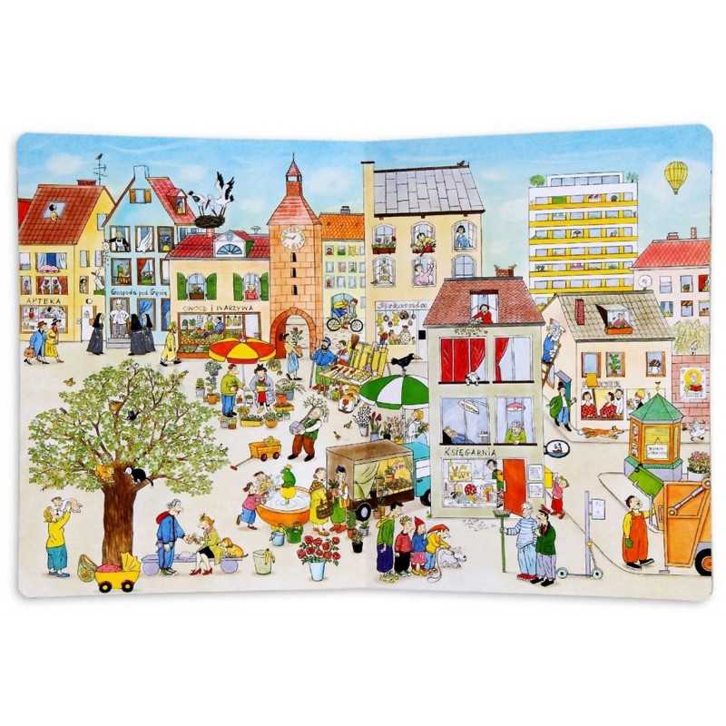 Każda strona tej książki to barwna, pełna szczegółów i postaci ilustracja przedstawiająca fragment miasta. Na kolejnych rozkładówkach odnajdujemy tych samych bohaterów w różnych miejscach i momentach dnia. Wypatrywanie ich i układanie opowieści o ich przygodach to wciągająca zabawa na długie godziny.