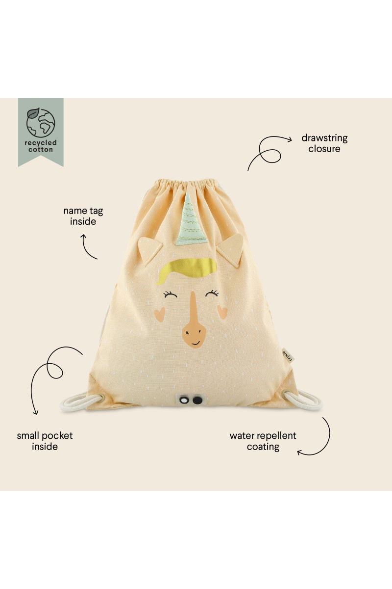 Przyjemny i praktyczny worek z naszymi przyjaciółmi zwierzętami, którą możesz także używać jako torbę do basenu dzięki jej wodoodpornej warstwie. Zwisające uszy dodają zabawny detal. Sposób łatwego otwierania i zamykania za pomocą dwóch praktycznych. W środku znajduje się metka na imię oraz mała kieszonka, w której można przechowywać drobne przedmioty.