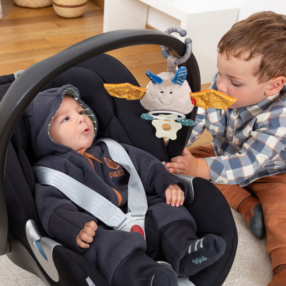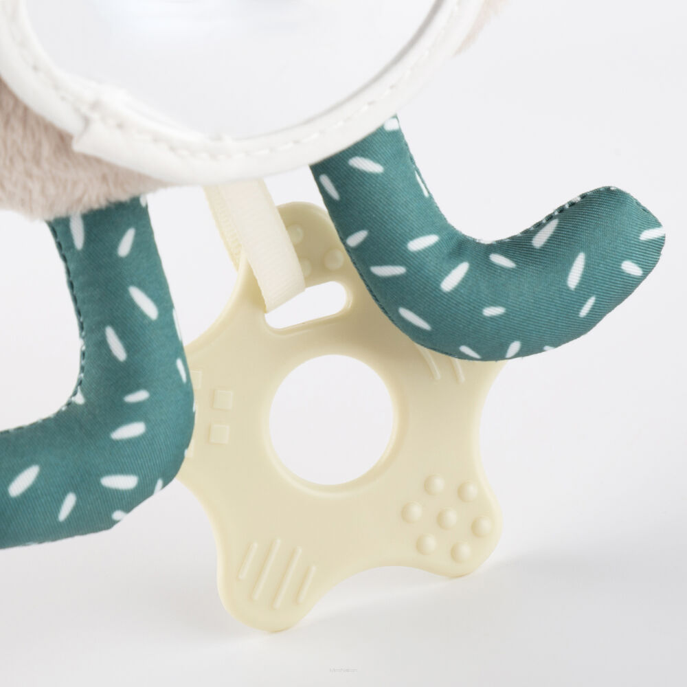 Zabawkę można bardzo łatwo przymocować do wózka, nosidełka lub łóżeczka dzięki sprytnemu pierścieniowi z wypustkami, który sam w sobie może pełnić funkcję gryzaczka. Haftowane detale, wysoka jakość materiałów i dopracowane wykonanie gwarantują bezpieczeństwo i trwałość, nawet przy częstym praniu.