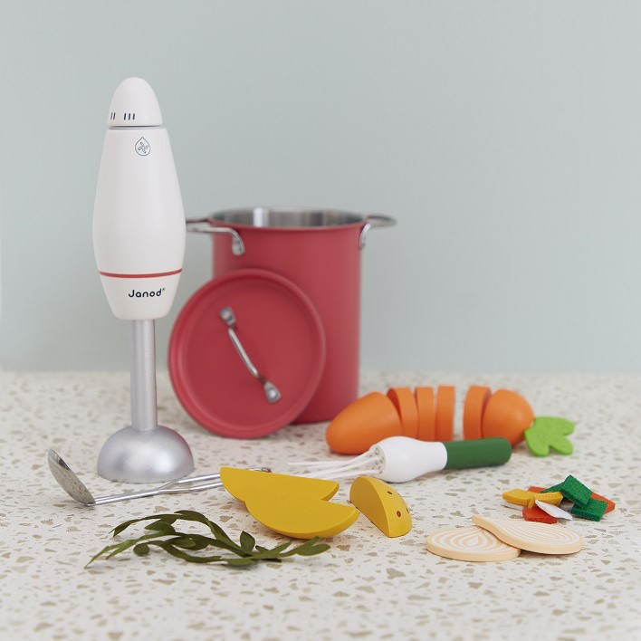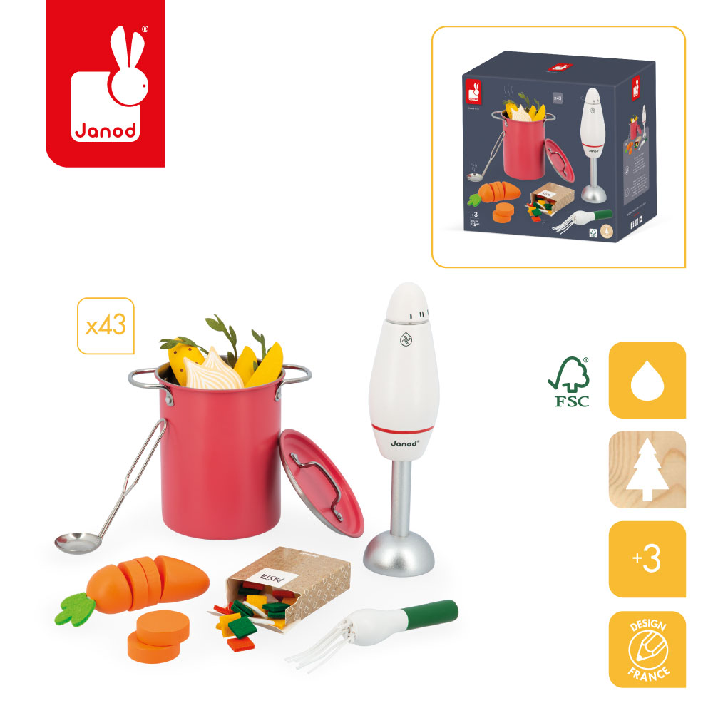 Zestaw do gotowania zupy marki Janod to urocza drewniana zabawka, przeznaczona dla dzieci od 3 roku życia, która zachęca do twórczej zabawy w gotowanie. Zestaw zawiera drewniany blender i inne akcesoria kuchenne, które pozwalają dzieciom na udawanie, że przygotowują pyszne zupy.